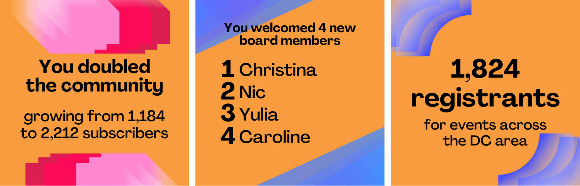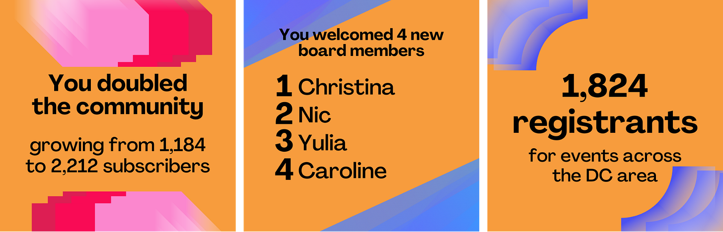 Our community nearly doubled, growing from 1,184 subscribers to 2,212. We hosted 11 events across the city, from rooftop meetups to policy chats to collaborative happy hours, with 1,824 registrants total. We also welcomed four new board members this year β Christina, Yulia, Nic, and Caroline β each bringing new energy, ideas, and perspectives to keep this community thriving in 2026.